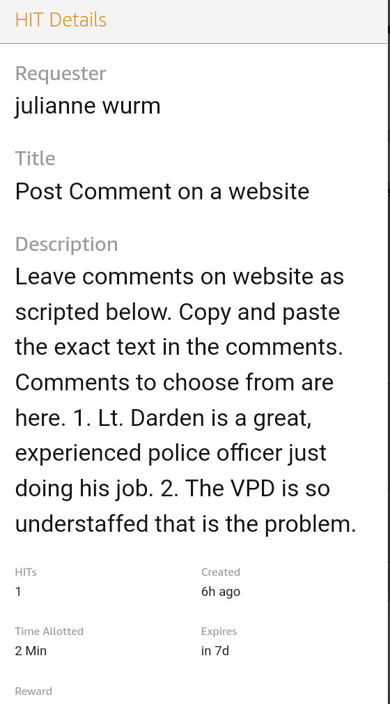 The listing sought to have commenters respond to Facebook posts with messages such as, “Lt. Darden is a great, experienced police officer just doing his job,” or “The VPD is so understaffed that is the problem.”
