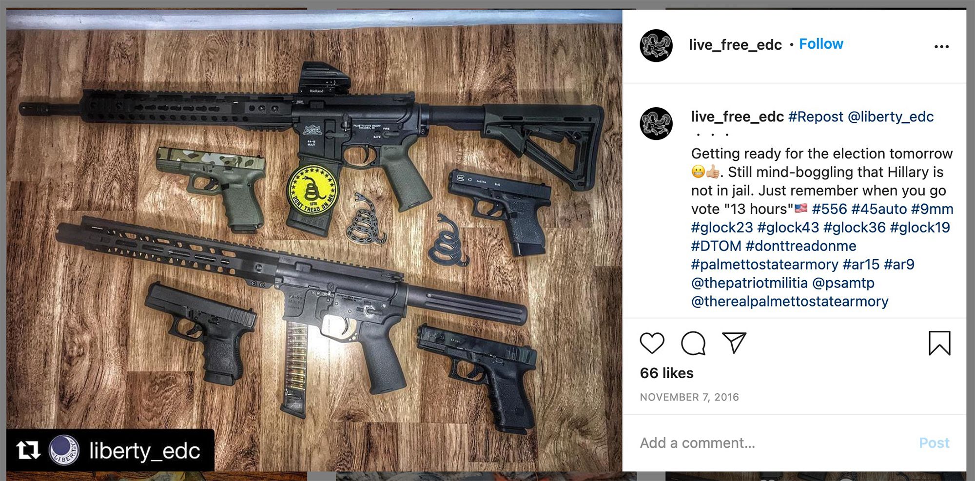 Before the 2016 election, Stockton shared a photo of several guns with the caption, “getting ready for the election tomorrow.” The same year, Stockton’s colleague at the sheriff’s office, Sgt. Cully Pratt — the brother of actor Chris Pratt — made Stockton a board to hang his AR-15 rifle with a Three Percenter symbol.