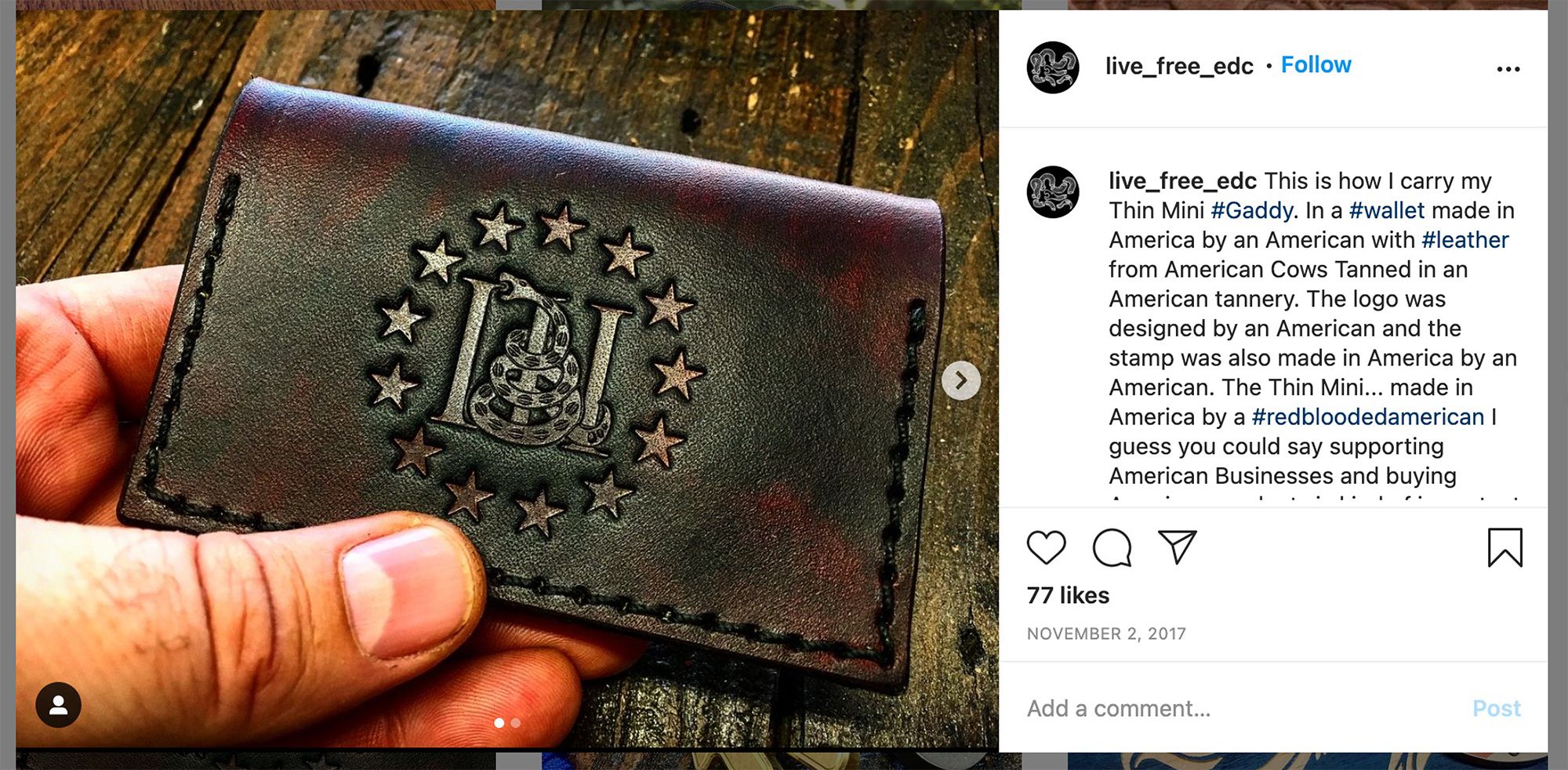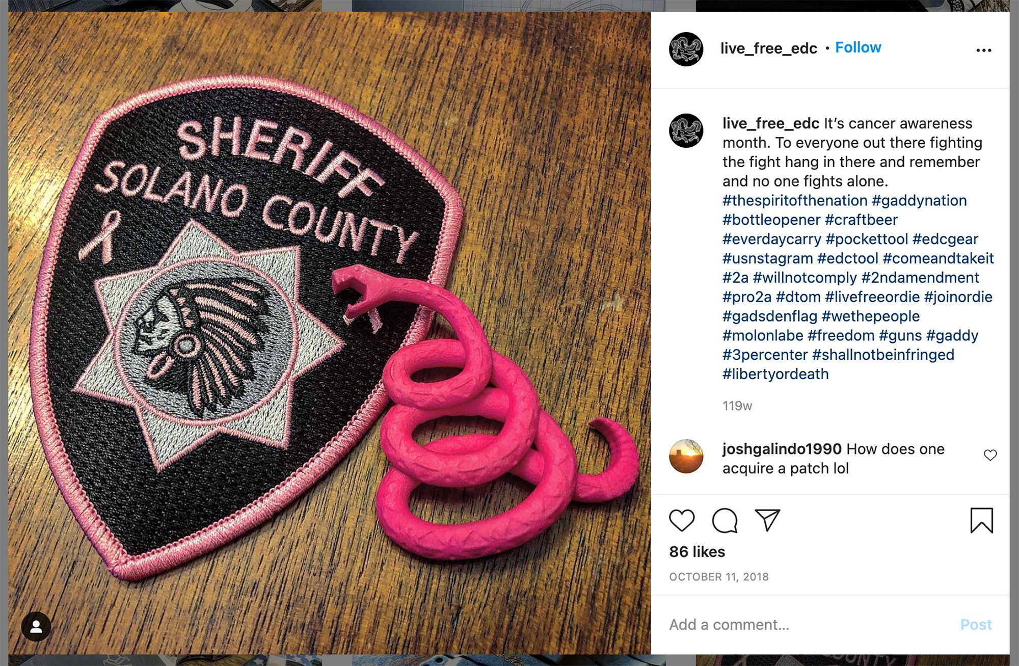 Stockton has been the subject of controversy ever since revelations that he sold crafts with Three Percenter symbols online, including leather goods under the name High Brass Leather and metal under the name Live Free EDC. On Instagram pages to promote his businesses, Stockton reposted numerous photos with Three Percenter symbols and frequently used the #3percenter hashtag. Stockton tagged the sheriff’s official Instagram page from his leatherworking page. Both of his pages included the sheriff’s office emblem.