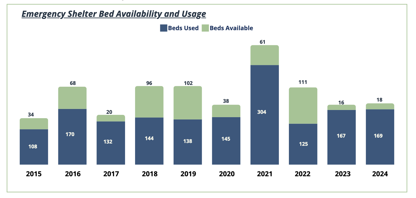 The report also shows that available shelter space in the county has shrunk in recent years and that nearly all the emergency shelter beds were full, with over 90% of the 187 available beds in the county taken. Only one of 121 transitional housing beds was available at the time of the survey.