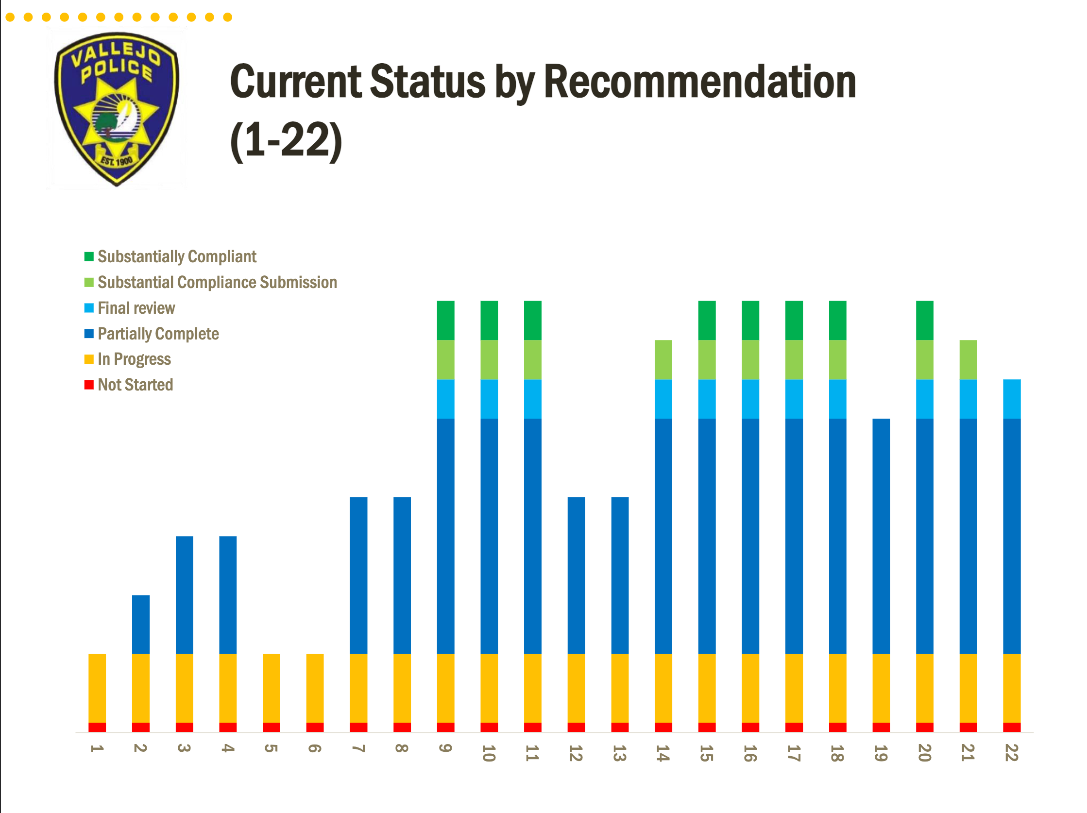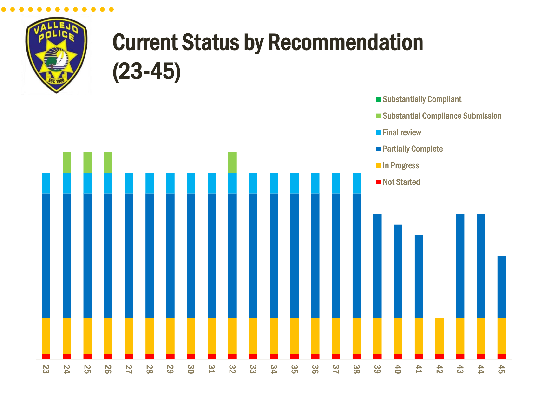 In the Vallejo police presentation, Ta and Knight described the department's progress toward the 45 reform recommendations from the DOJ with a colorful bar graph that depicted different stages of completion from “not started” to “substantially complete.” Knight said that during the first year of DOJ oversight the department’s efforts mostly involved planning and determining the scope of the work required to institute the recommendation.
