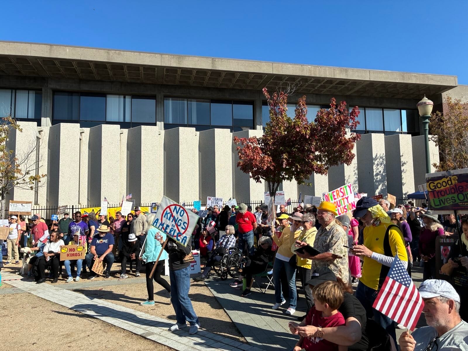 VALLEJO – Over a thousand protesters marched through downtown Vallejo this morning as part of the movement labeled “No Kings Day.” Across the nation, close to 2600 similar protests were organized. “This is the largest U.S. mass rally in history,” said Bruce Marks, one of the event organizers.