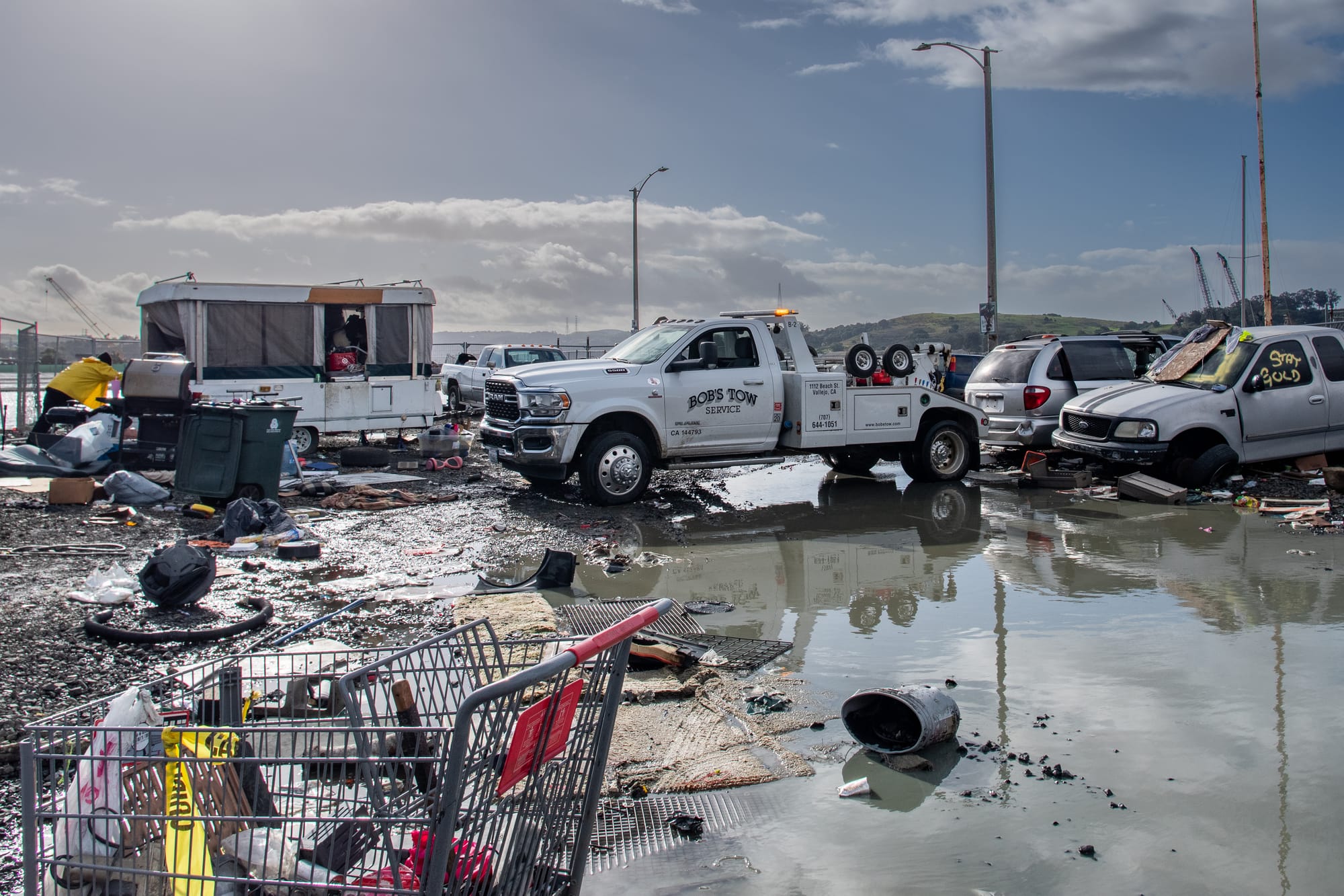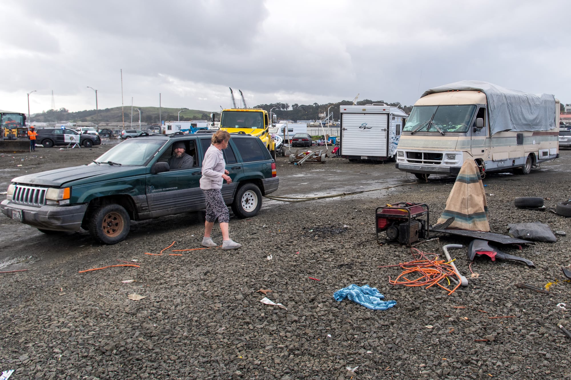 The city workers who arrived on Monday morning focused first on removing abandoned vehicles and scooping up trash, while remaining residents scrambled to get their RVs and vehicles running. The city’s “Notice to tow” says that impounded property will be stored for ninety days free of charge, and that anything unclaimed after that time will be disposed of.
