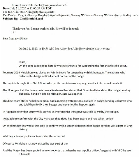 But Allio’s email reveals that the department disclosed details to Cole that it still has not publicly confirmed. In fact, the department has yet to disclose the name of any officer who was involved in the badge bending practice, but Allio told Cole that the department knew about the practice as far back as February 2019 when then-Vallejo police Officer Ryan McMahon was placed on administrative leave regarding a separate issue.
