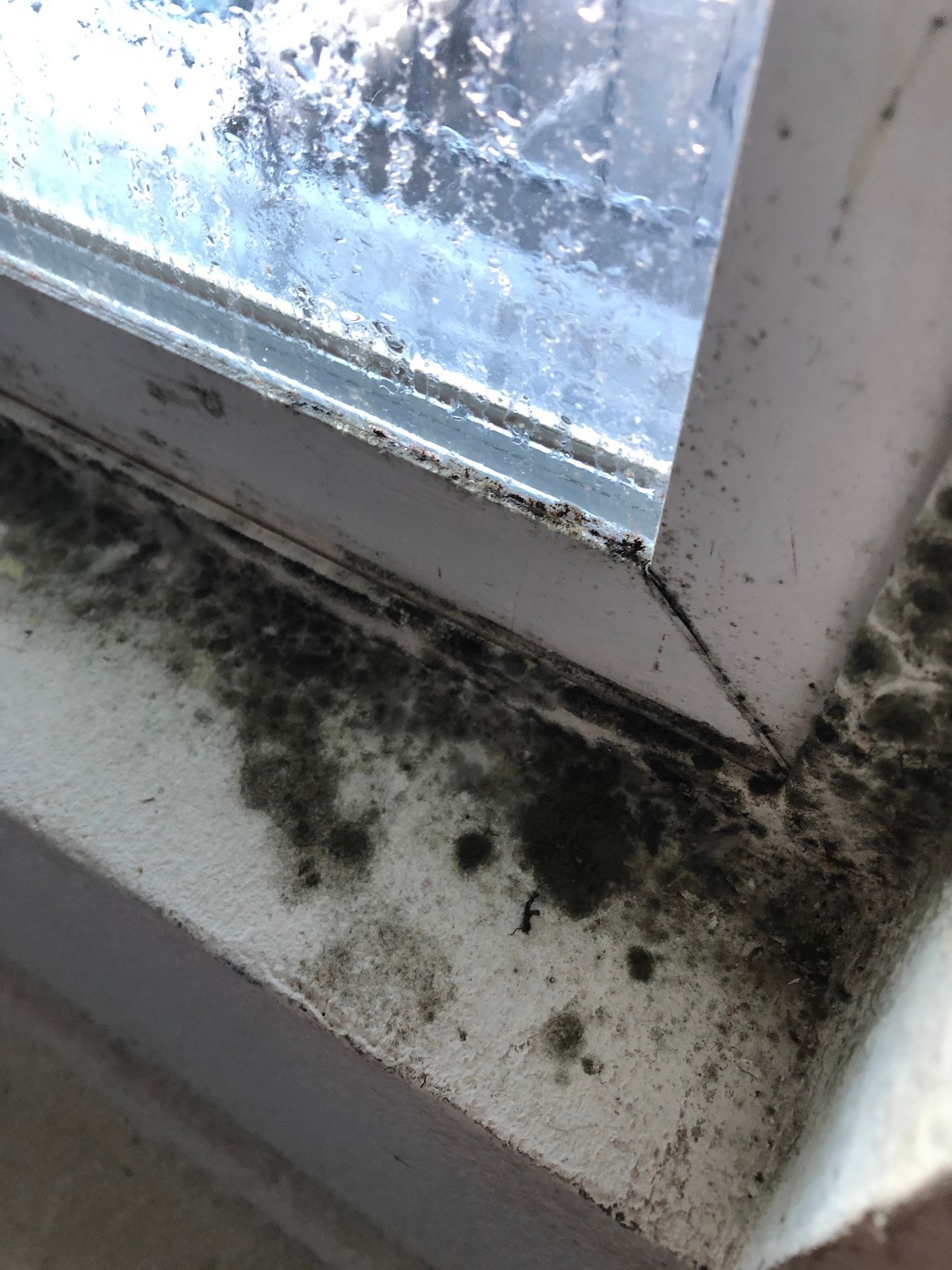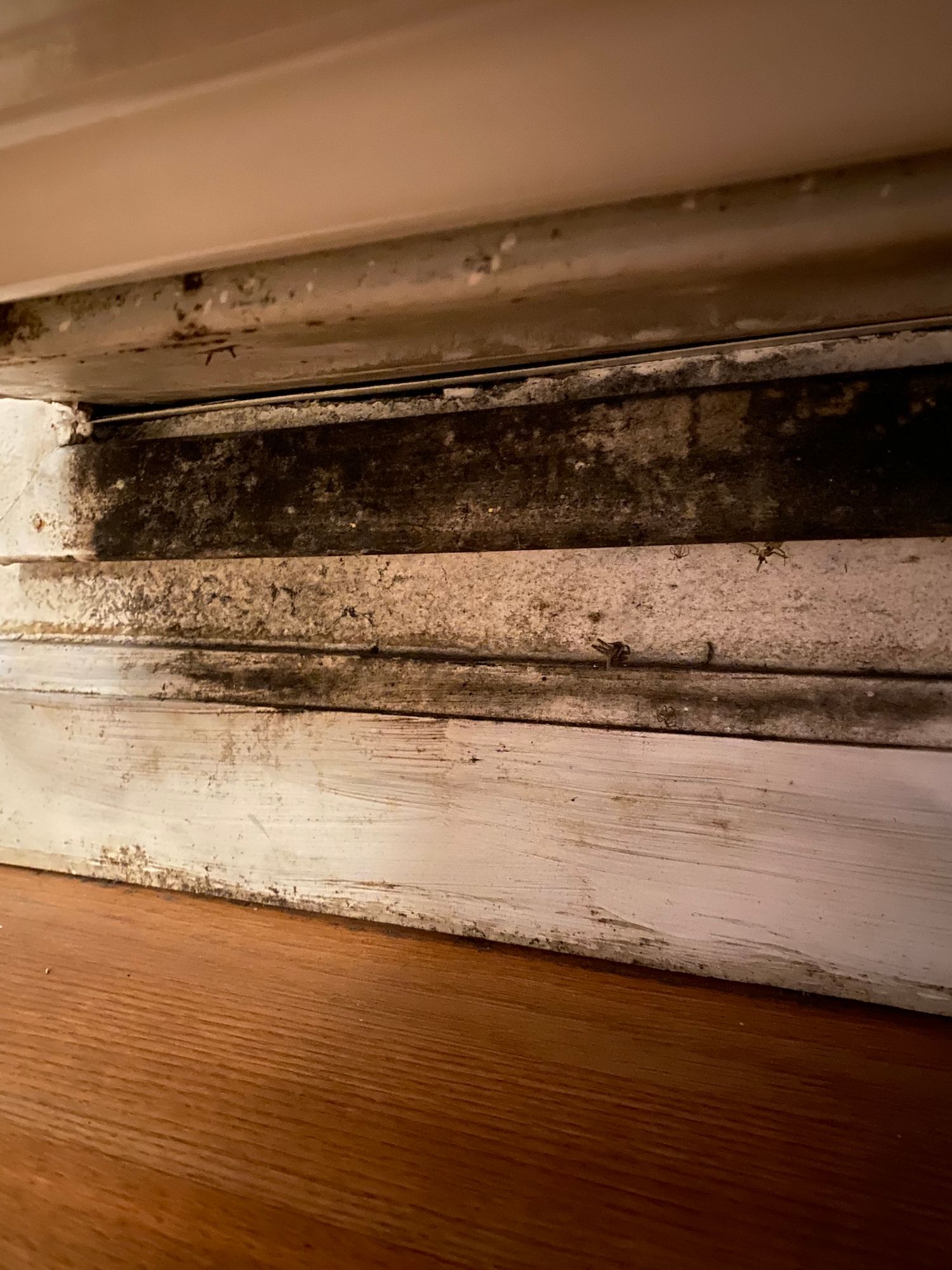 Numerous photos show rooms with large black patches of mold on walls, windowsills, in the air conditioners, growing on the sides of doors and in corners of kitchens and bathrooms. Moisture readings in many of the units exceeded the top range of the instrument used.
