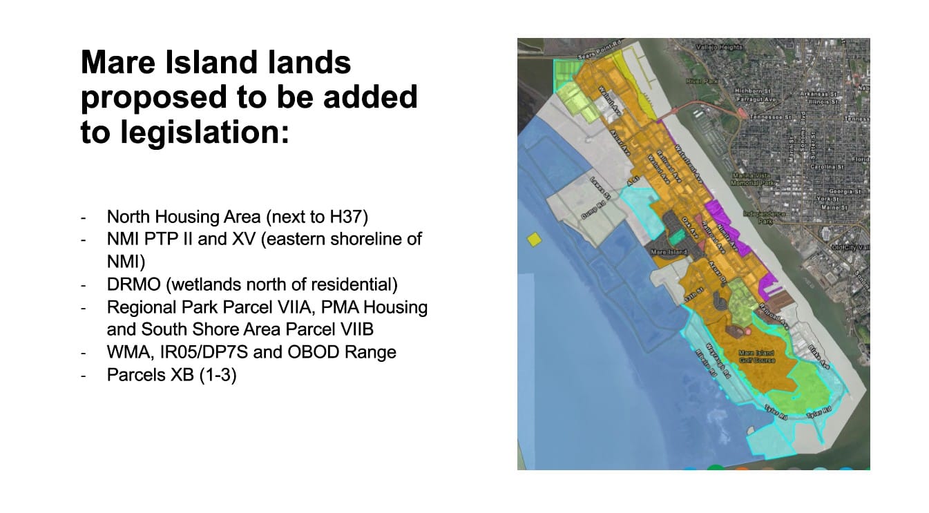The bill to expand the wildlife refuge was originally brought to the city for consideration in June 2024. It proposed several Mare Island sites to be added to the wildlife refuge, including a parcel near Highway 37 that would be designated as wildlife habitat, the Mare Island Preserve, and Navy-owned lands on the south side of Mare Island that will be transferred to the City of Vallejo when environmental remediation is complete.
