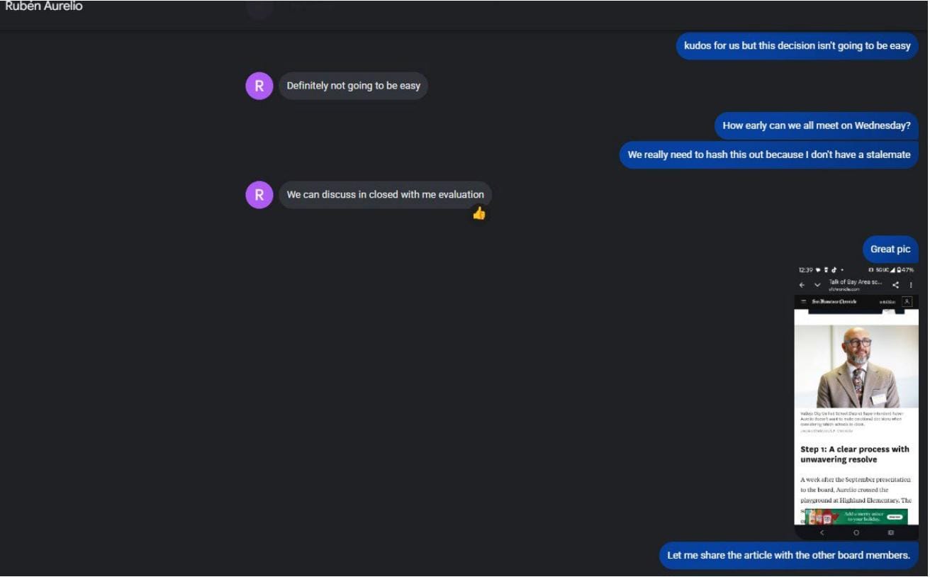 In the text exchange between Aurelio and Amboy, they discussed an article published in the San Francisco Chronicle that outlined how discussions of school closures in Vallejo’s school district tended to occur with less pushback from community members than in surrounding cities, like Oakland and San Francisco. In the exchange, Amboy said he would share the article with other board members.